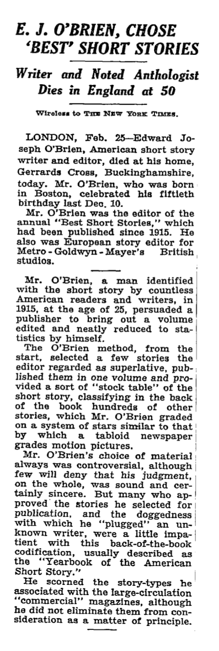 El creador fue un poeta, traductor y editor llamado Edward J. O’Brien. Desde 1915 hasta 1941, cuando murió de un infarto, O’Brien realizó y publicó una selección de los que, a su juicio, eran los veinte mejores relatos publicados durante el año por diversas revistas y periódicos de Estados Unidos.